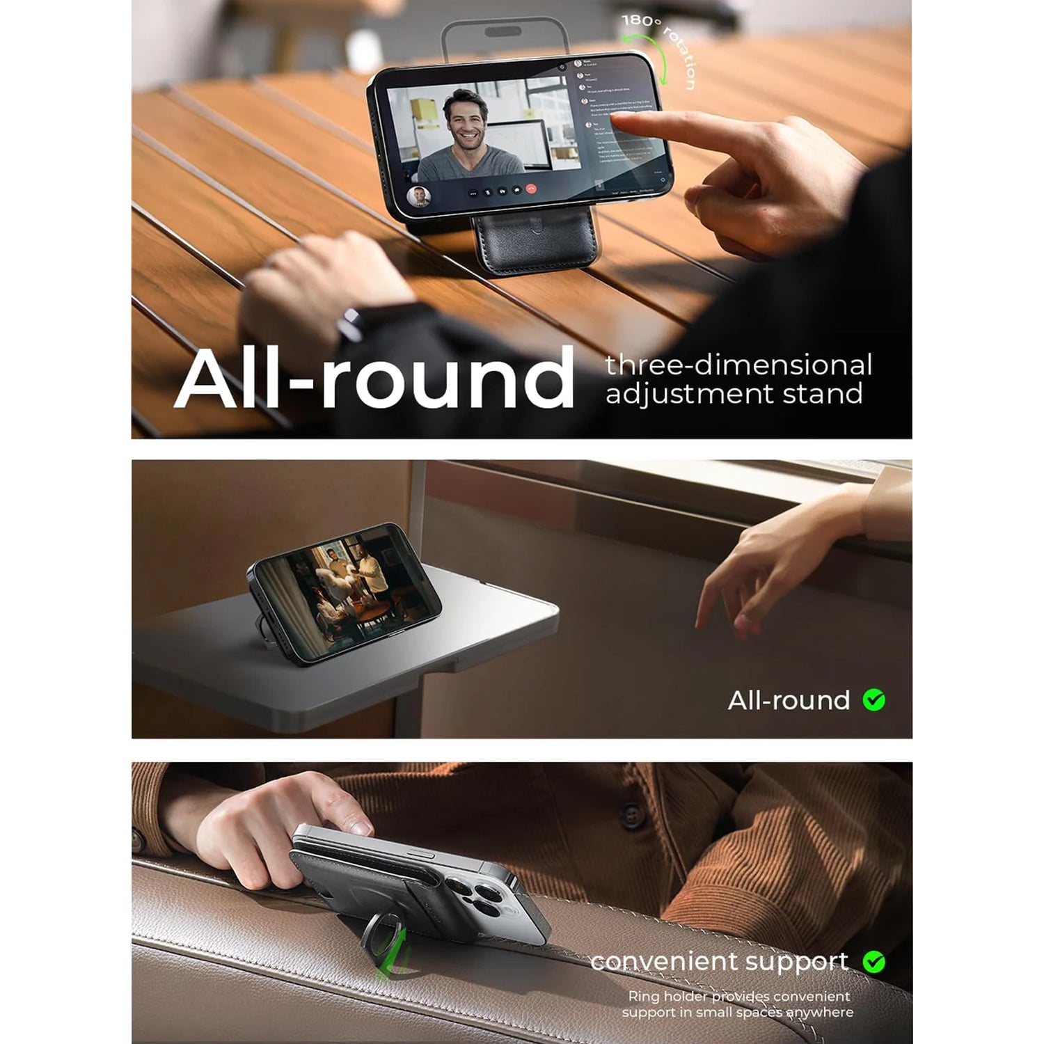 IPHONE WALLET STEREOSCOPIC OMNI-DIRECTIONAL ANGLE ADJUSTMENT: You can adjust the magnetic wallet for iphone at any angle 360°, the phone card holder with ring provides low angle and small space support, find the perfect angle anytime, anywhere, watch the ball game, programmes, family video calls