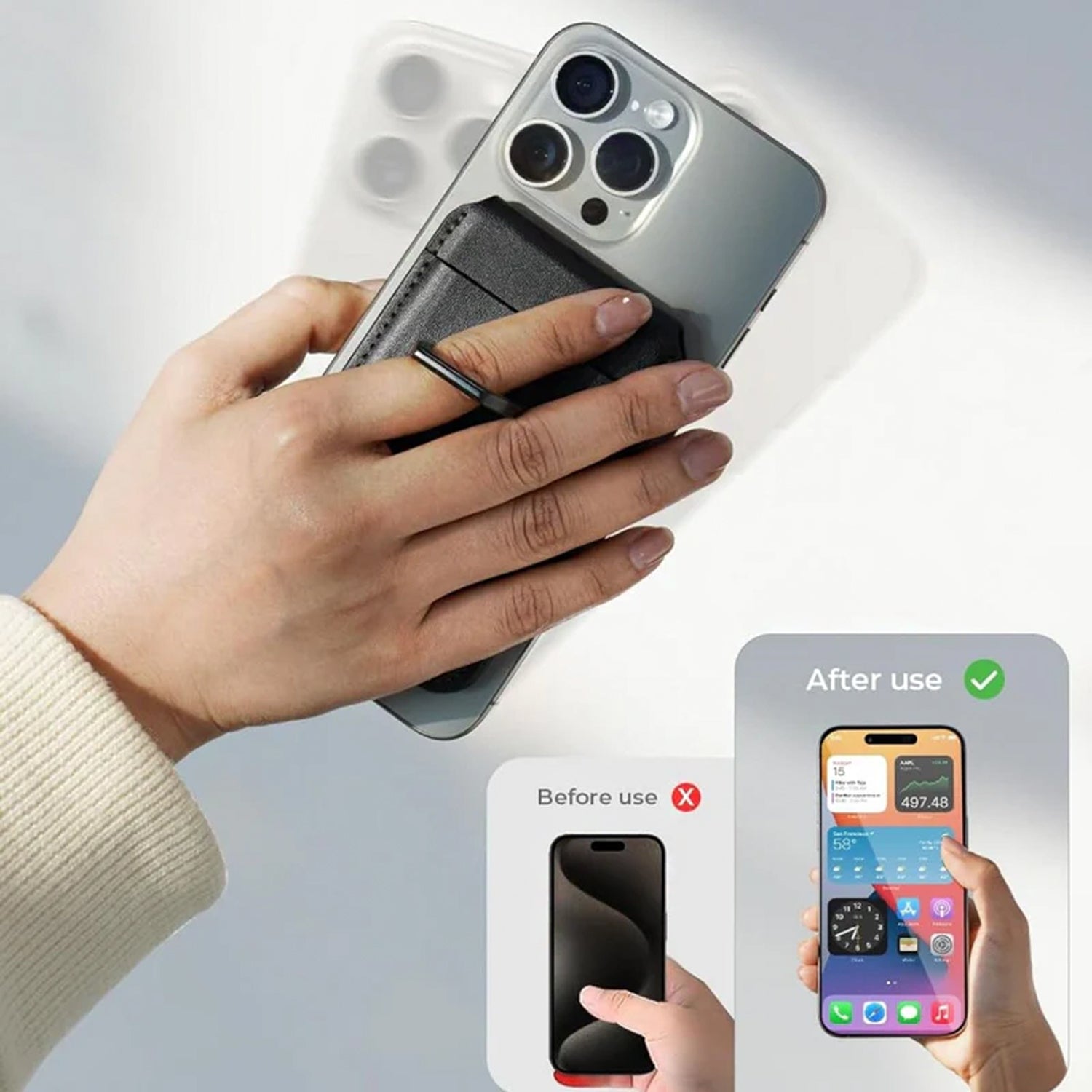CONVENIENT PHONE CARD HOLDER WITH RING: The unique addition of an ultra-convenient finger ring protects your phone while on the move and prevents it from falling out. It also makes it easier to operate the phone in any position, making the apple magsafe wallet the perfect life helper