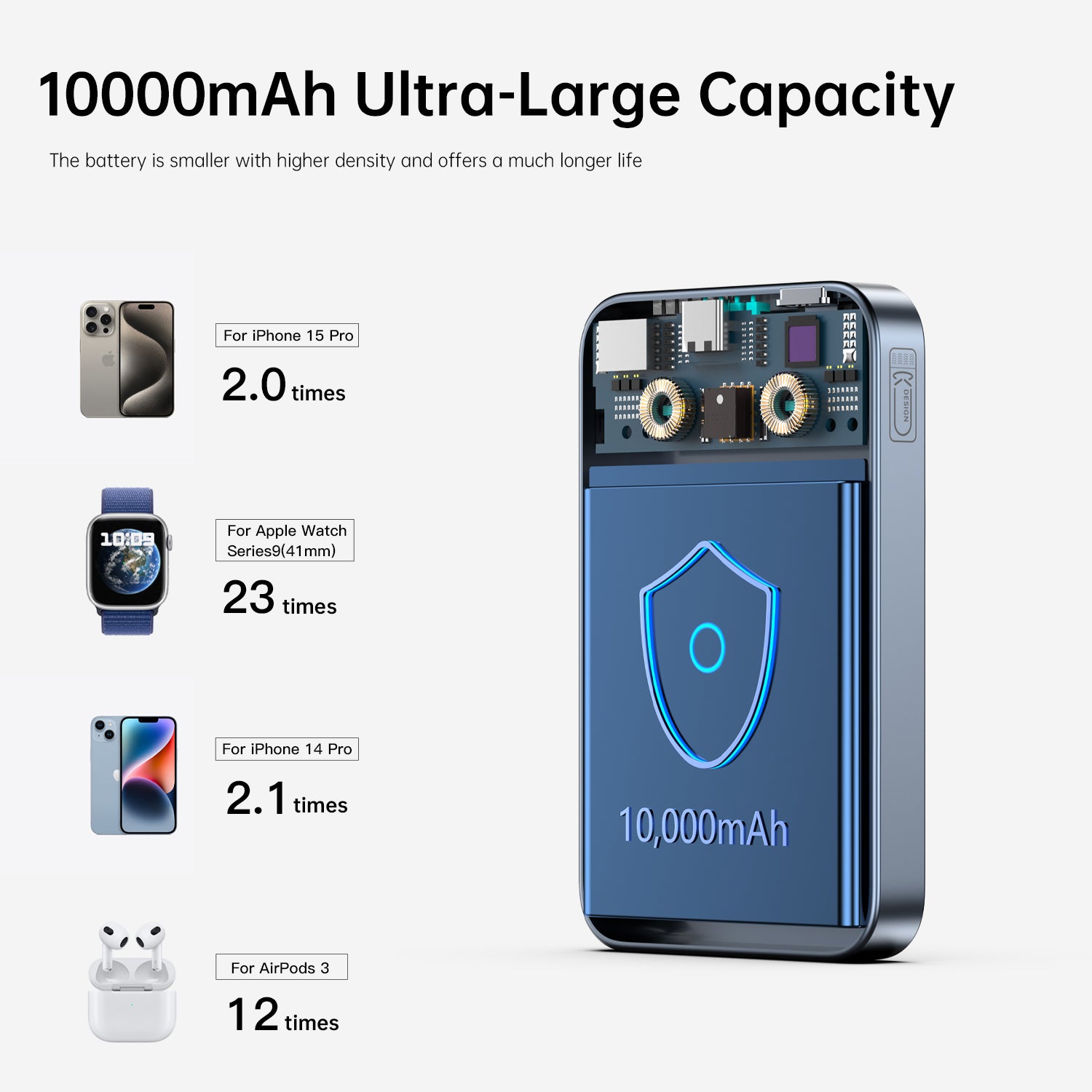 10000mAh Large Capacity Battery: Support iPhone 13&12 charging 3 times, mobile power pack uses the latest magnetic suction technology, strong magnets ensure that the mobile power is firmly locked to your cell phone, charging immediately after contact, built-in LED digital display, so you know the remaining power, no more guessing to use the power.