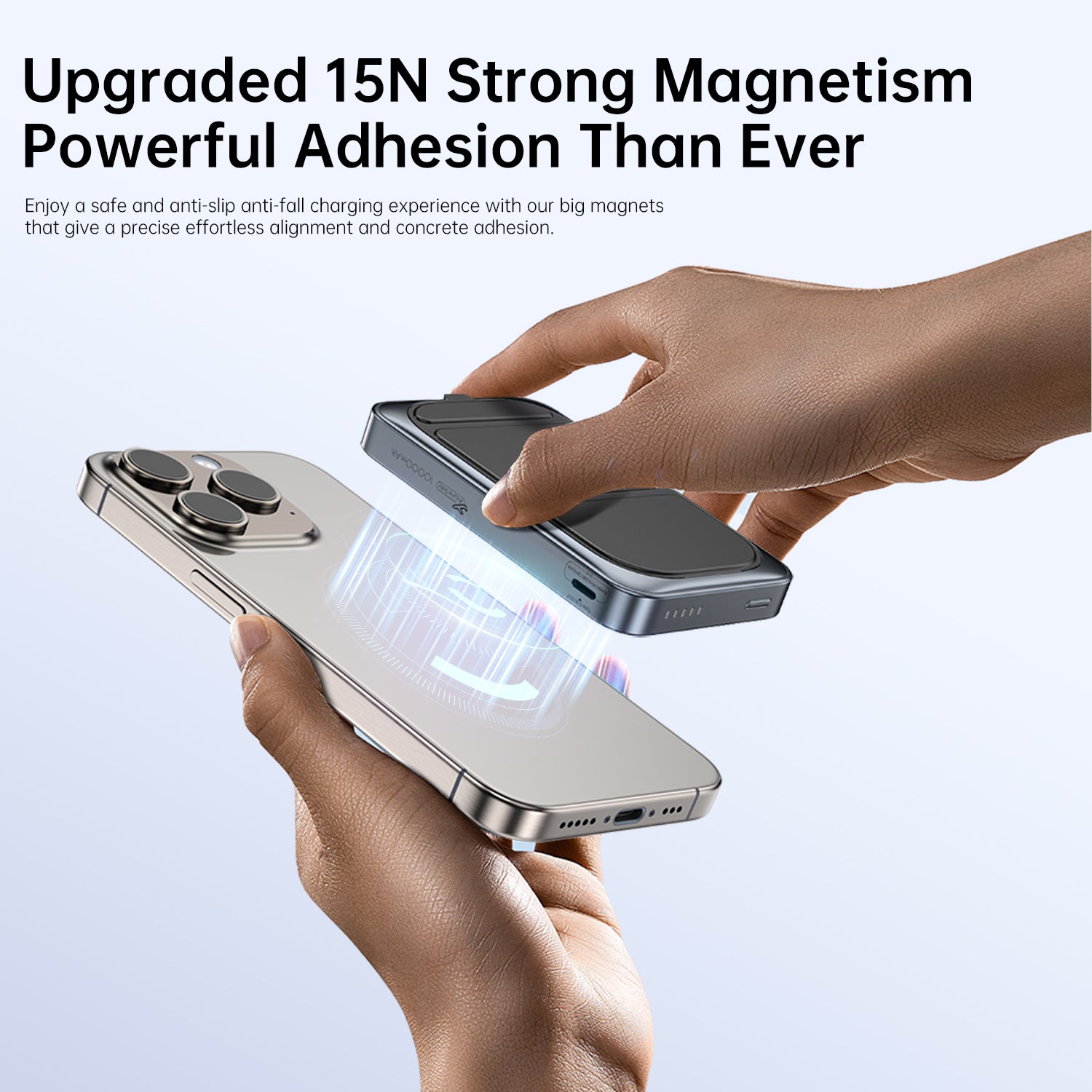 Pocket-Sized and Magic Foldable Stand : With a circumference the size of a credit card and a weight of only 0.4 pounds, the small magnetic battery pack compact design makes it easy to hold while talking on your phone, so you can take calls, take photos, etc. with one hand.Your phone charges wirelessly while the practical foldable stand supports your phone (horizontally or vertically) and keeps your phone charged while FaceTiming