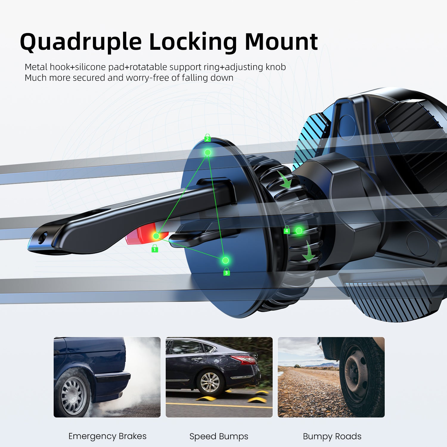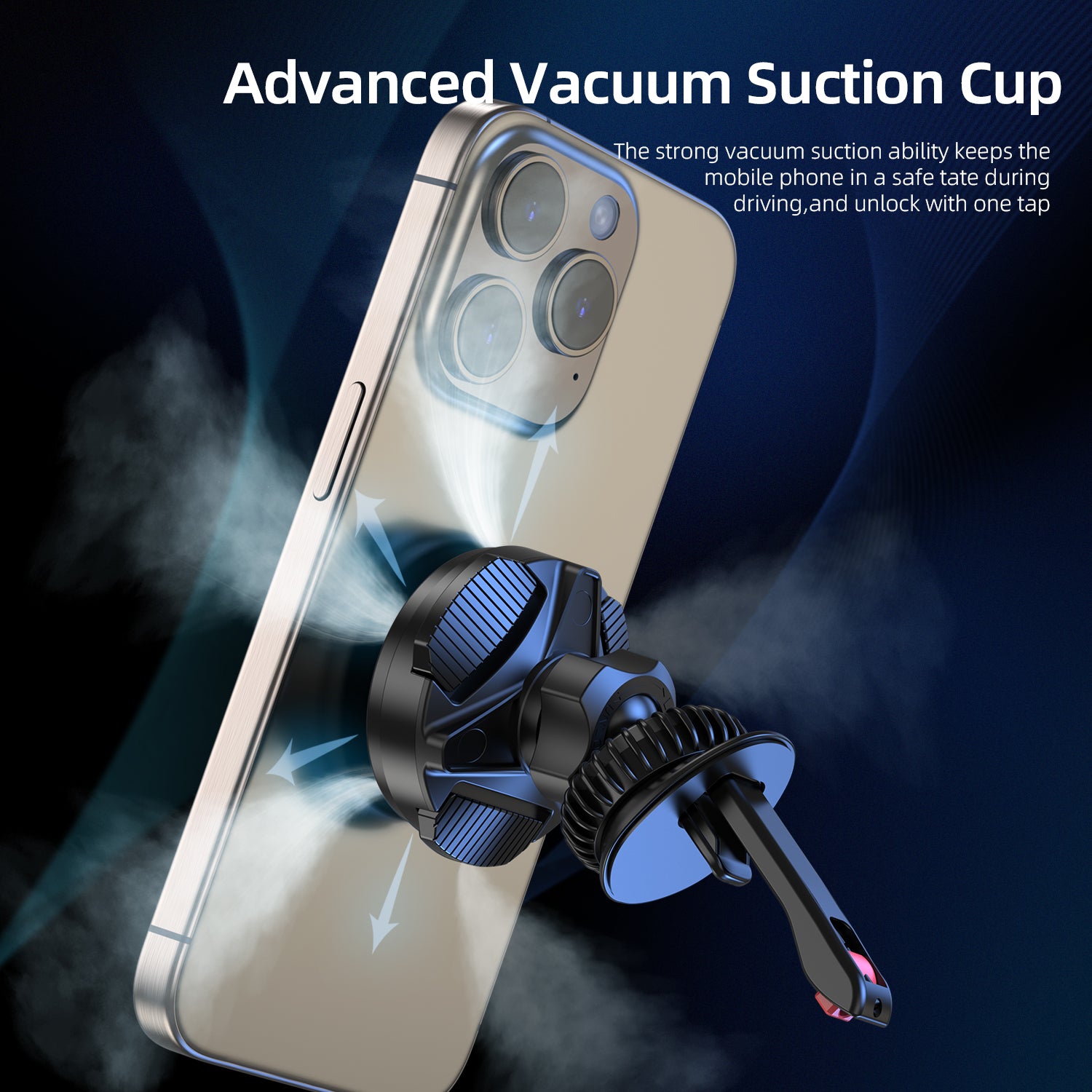 Adjustable Suction Cup : Adjustable suction cups allow the bracket to adapt to different types of surfaces, such as the vehicle's windshield, dashboard, or other surfaces. Users can make adjustments according to actual needs to ensure that the suction cups can tightly adhere and remain firm.