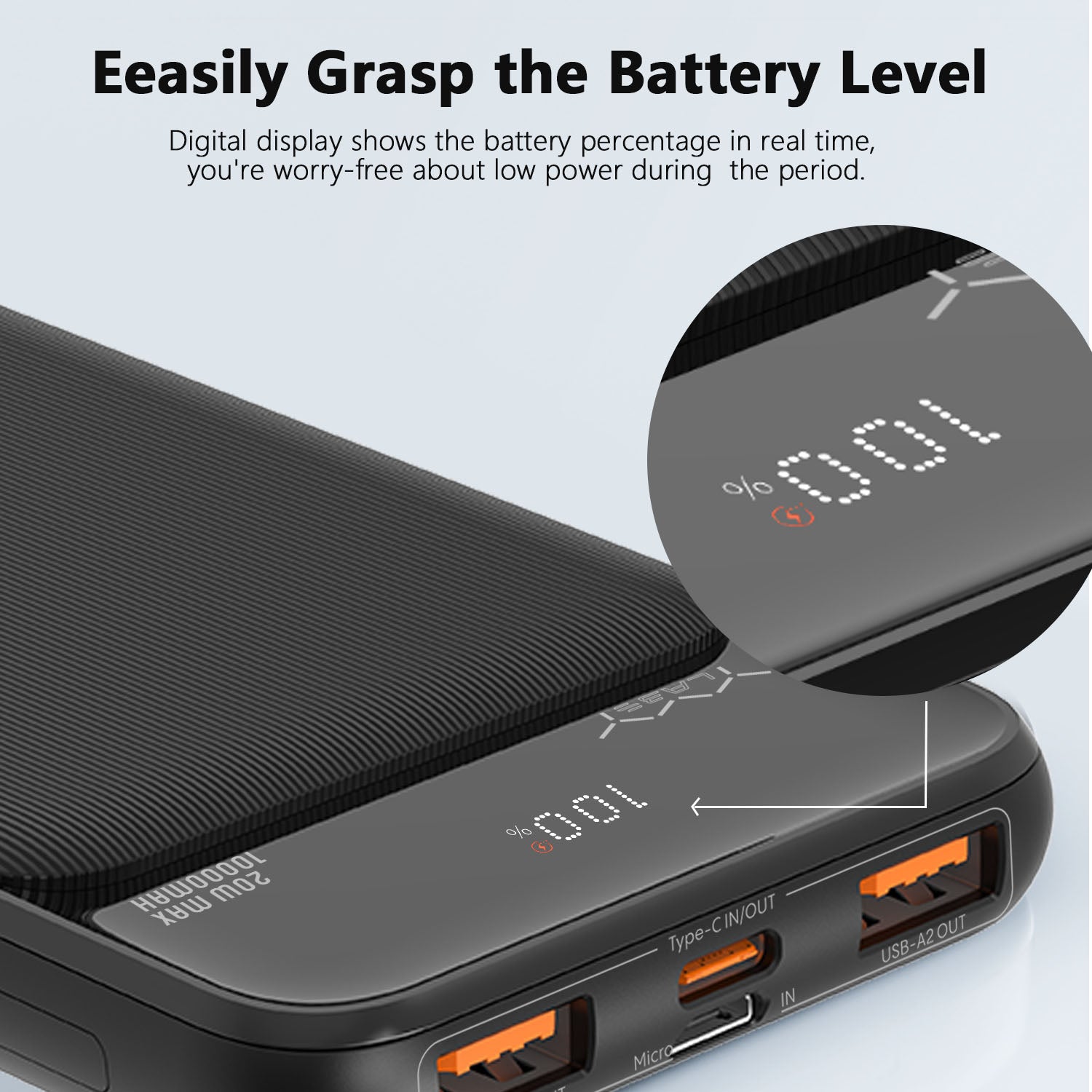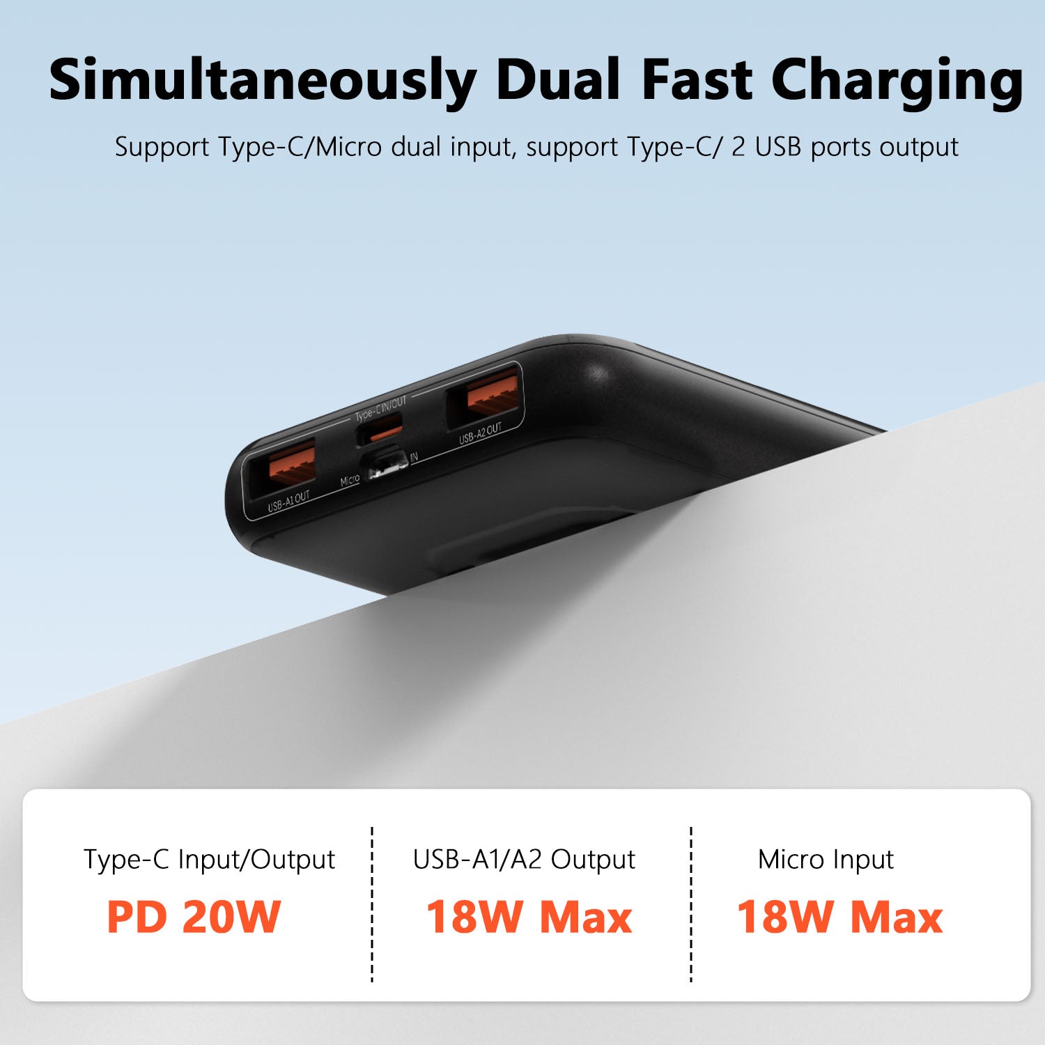 Dual Input Options: Featuring both Type-C and Micro inputs, with 20W and 18W maximum input respectively, this power bank offers flexibility and convenience in recharging.