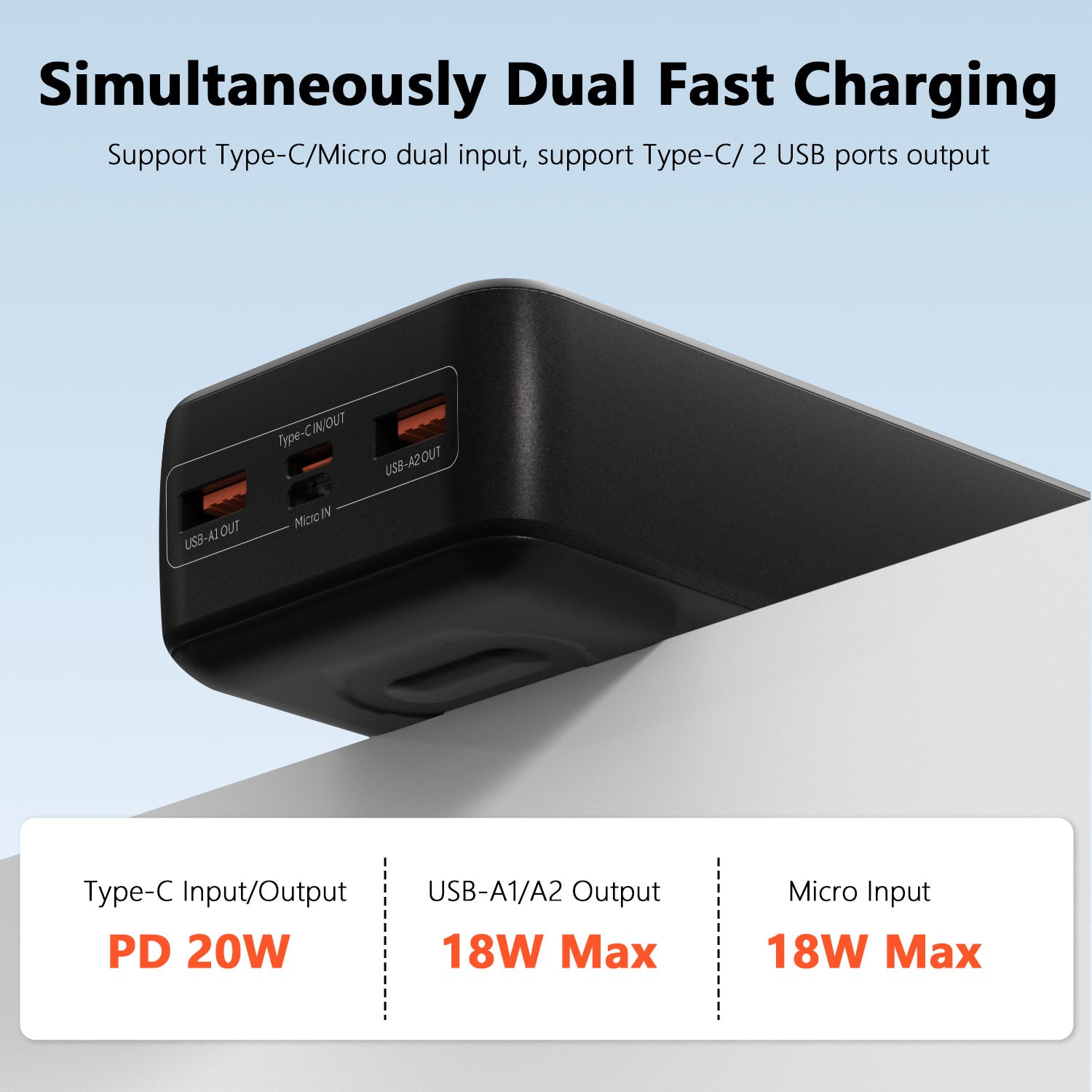 Dual Input Options: Featuring both Type-C and Micro inputs, with 20W and 18W maximum input respectively, this power bank offers flexibility and convenience in recharging.