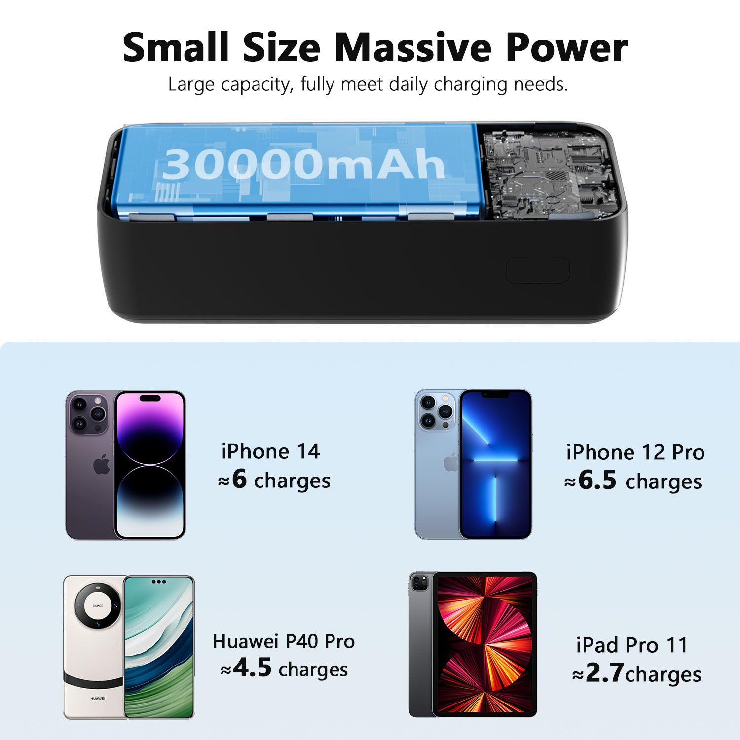 Massive Capacity: Boasting a powerful 30000mAh Polymer Lithium Battery, this power bank provides extensive charging capacity, ensuring multiple charges for your devices.