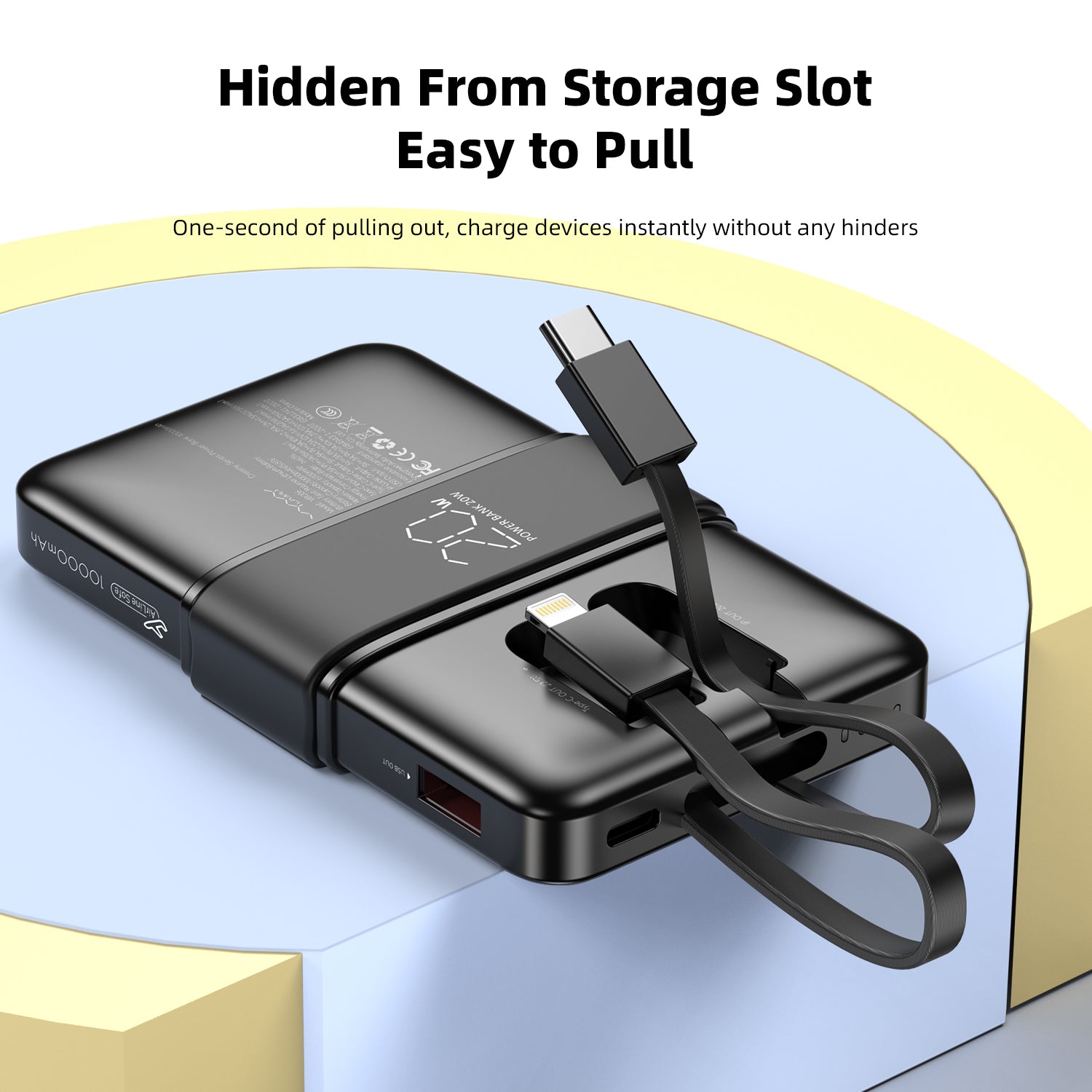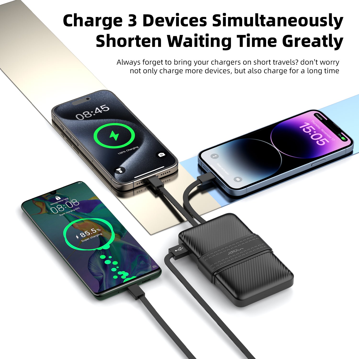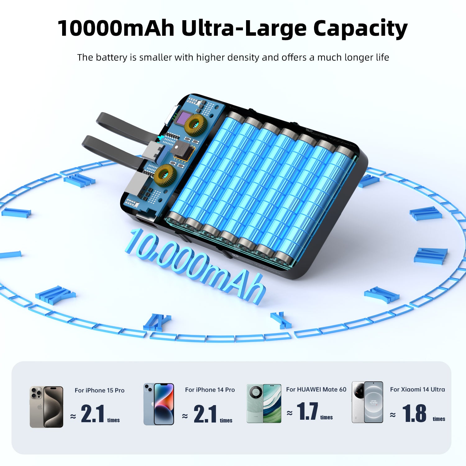 Portable charger Built in Cables: This portable charger power bank features built-in iPhone, USB-C, and USB-Micro cables, making it a one-stop solution. This portable charger power bank is universally compatible with popular smart devices, including the iPhone 16/15/14/13/12/11/8/7 series, XR, XS Max, Samsung Galaxy S24/S23/S22/S21/S10/S9/S8/Galaxy Z Flip/Z Fold/Galaxy A51/52/53/54/55/Note 20/10, Google Pixel series, and many more smartphones and USB-C devices
