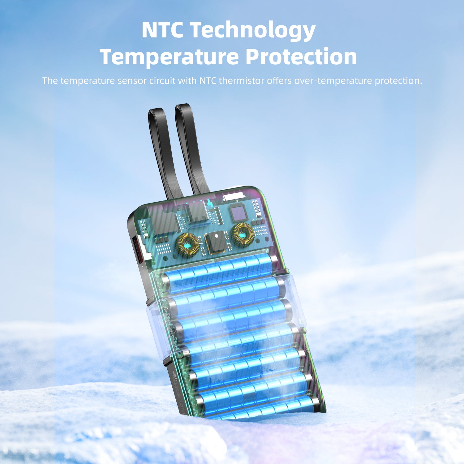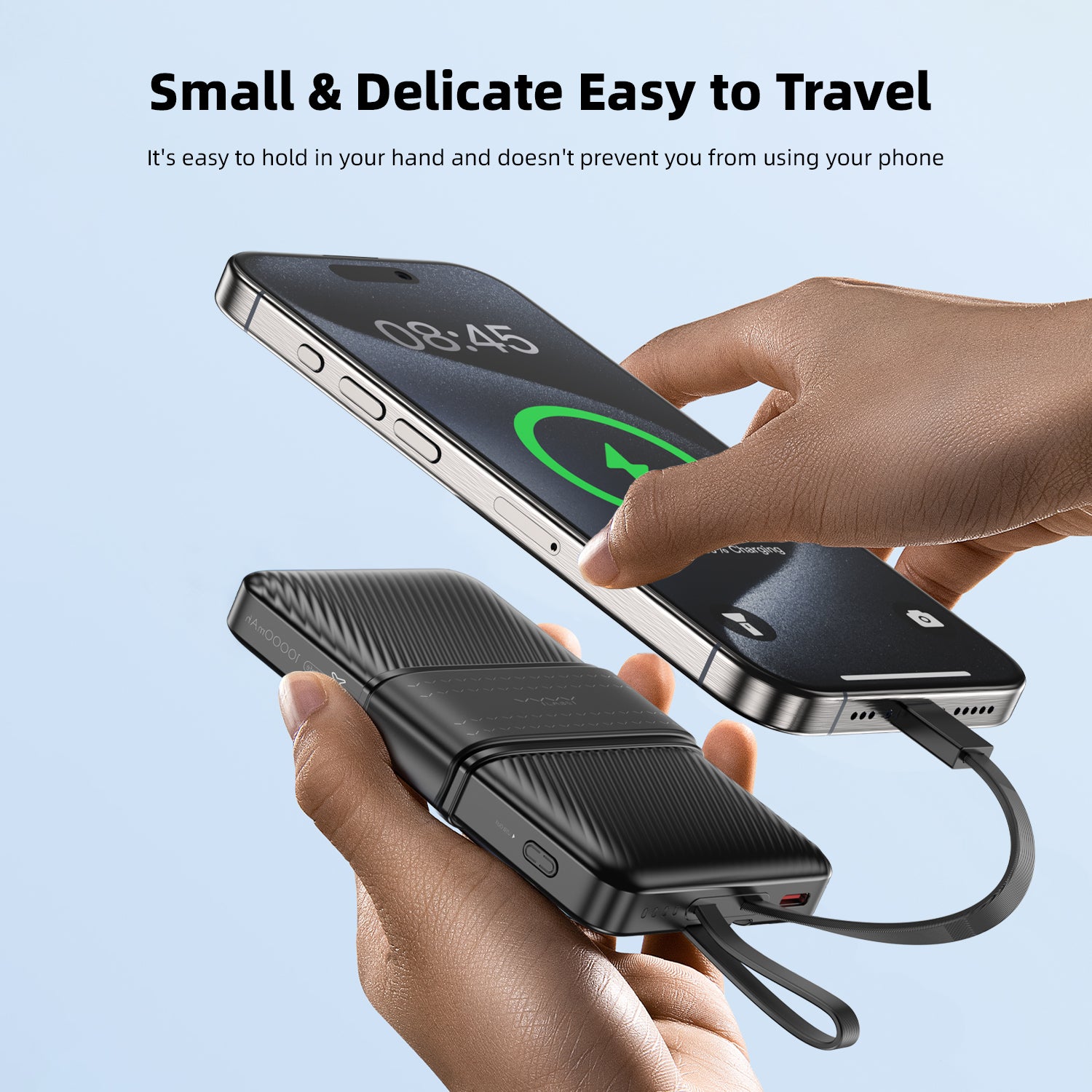 PowerBank Fast Charging : This power bank is equipped with both USB-C output cable and port, and supports quick charge output. This portable charger charges your iPhone 15 twice as fast as other regular chargers. Using the built-in USB input cable, the fast charging power bank itself recharges from 0% to full in less than 4.5 hours.