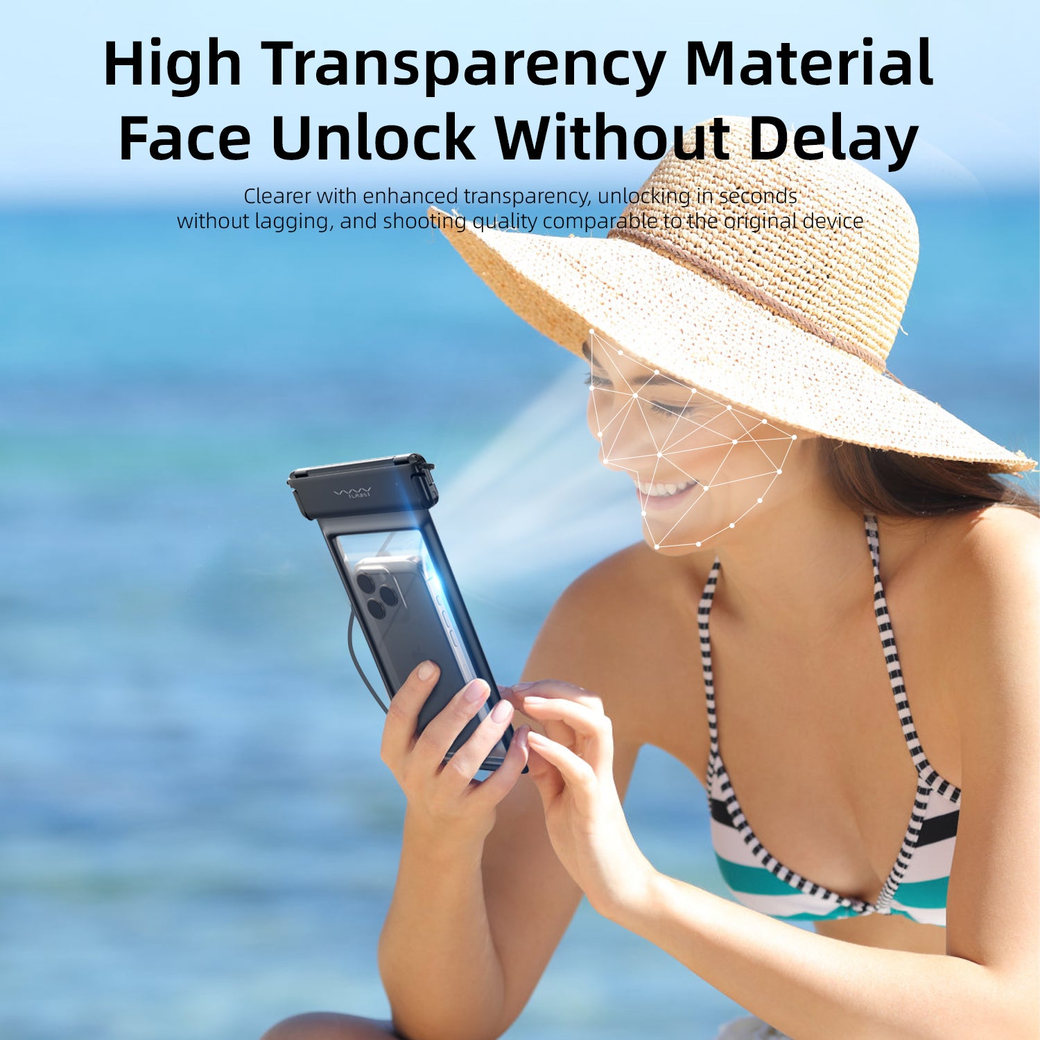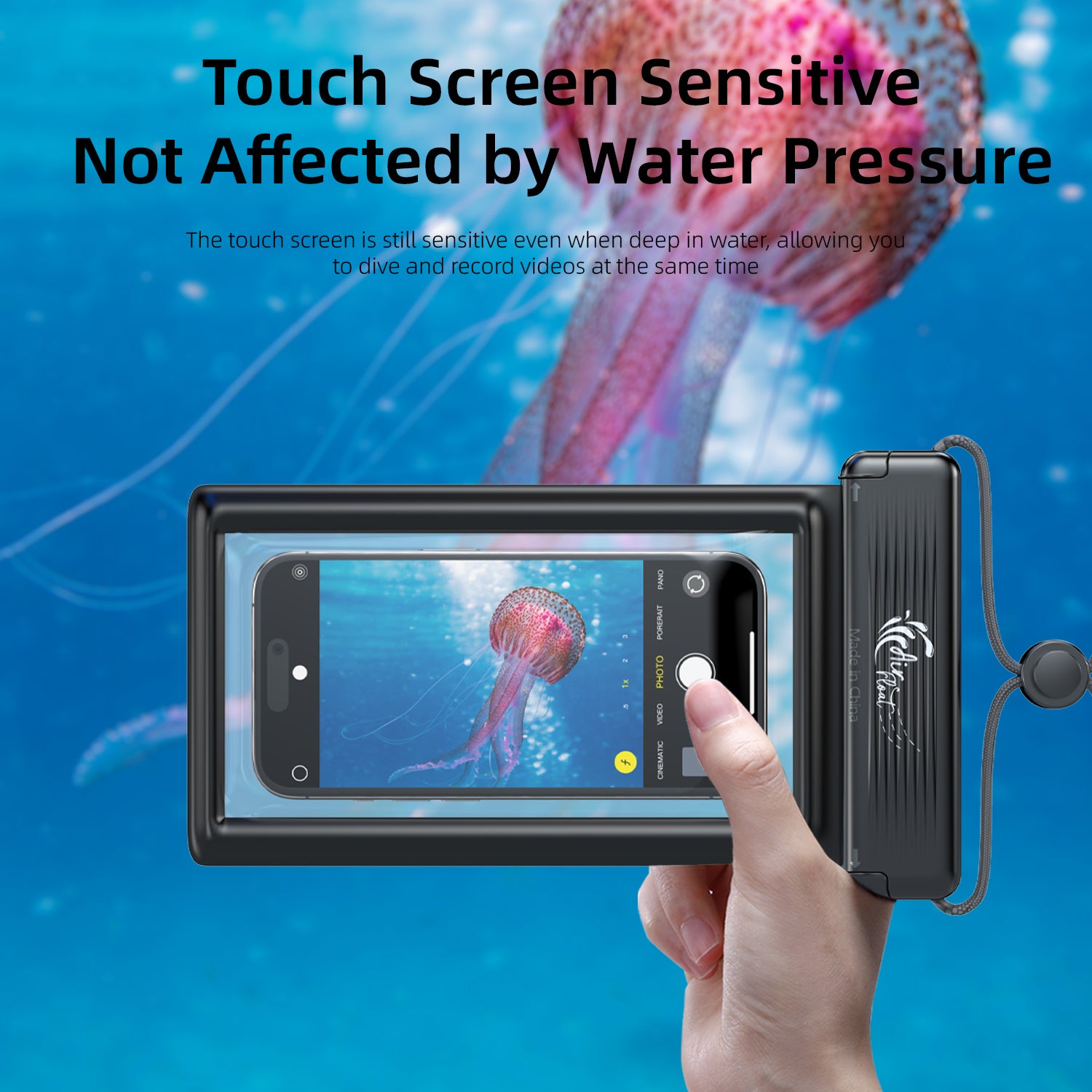 Ultra Clear Pics Underwater: Using high-transparency material technology, this beach phone case offers crystal clear shootings of the underwater world, and will not affect the clarity of the screen display. Tips: Affected by water pressure, it's normal for the screen sensitivity to decrease in water, at this time it is better to press the volume button to shoot.