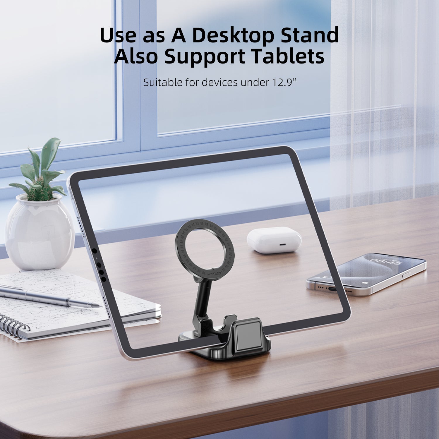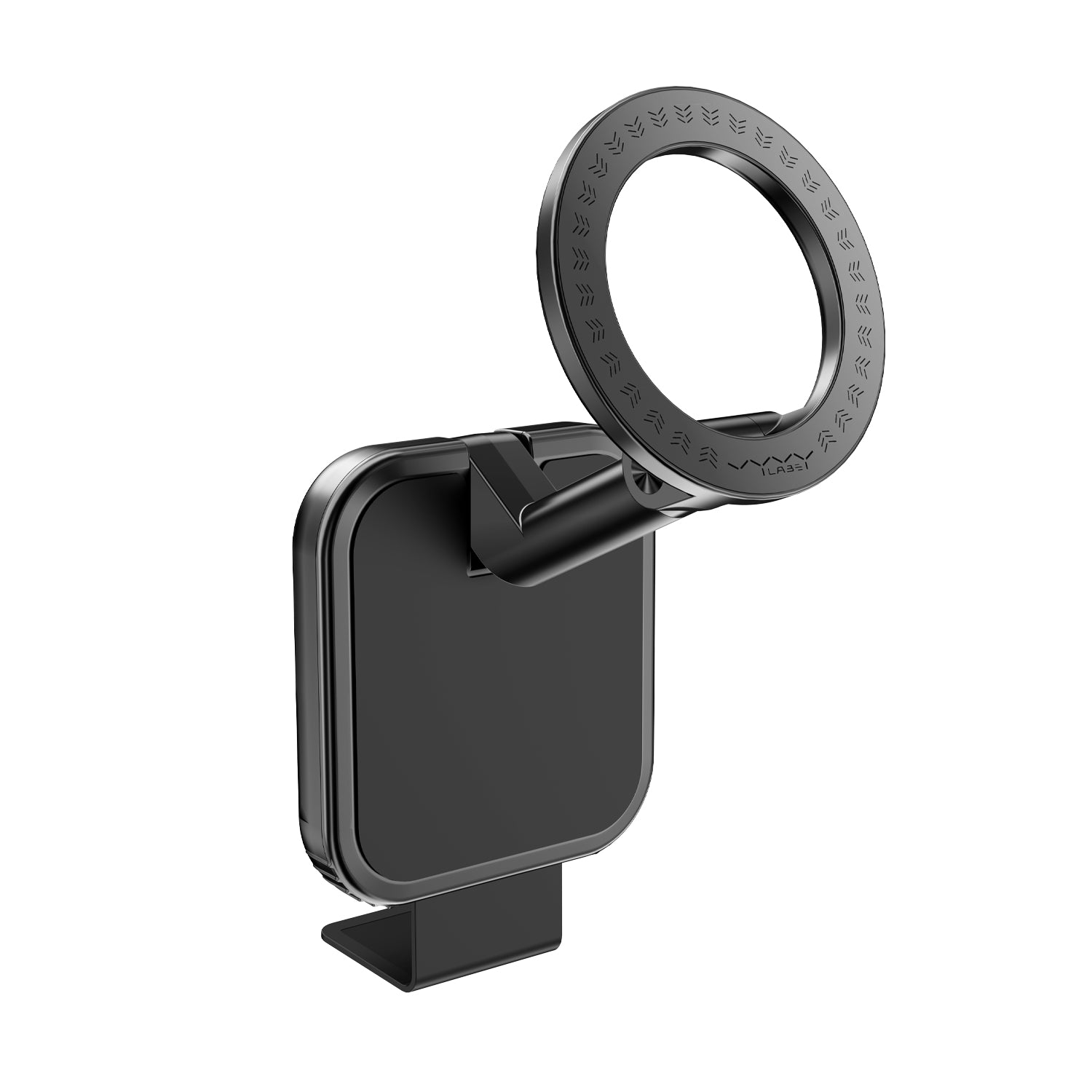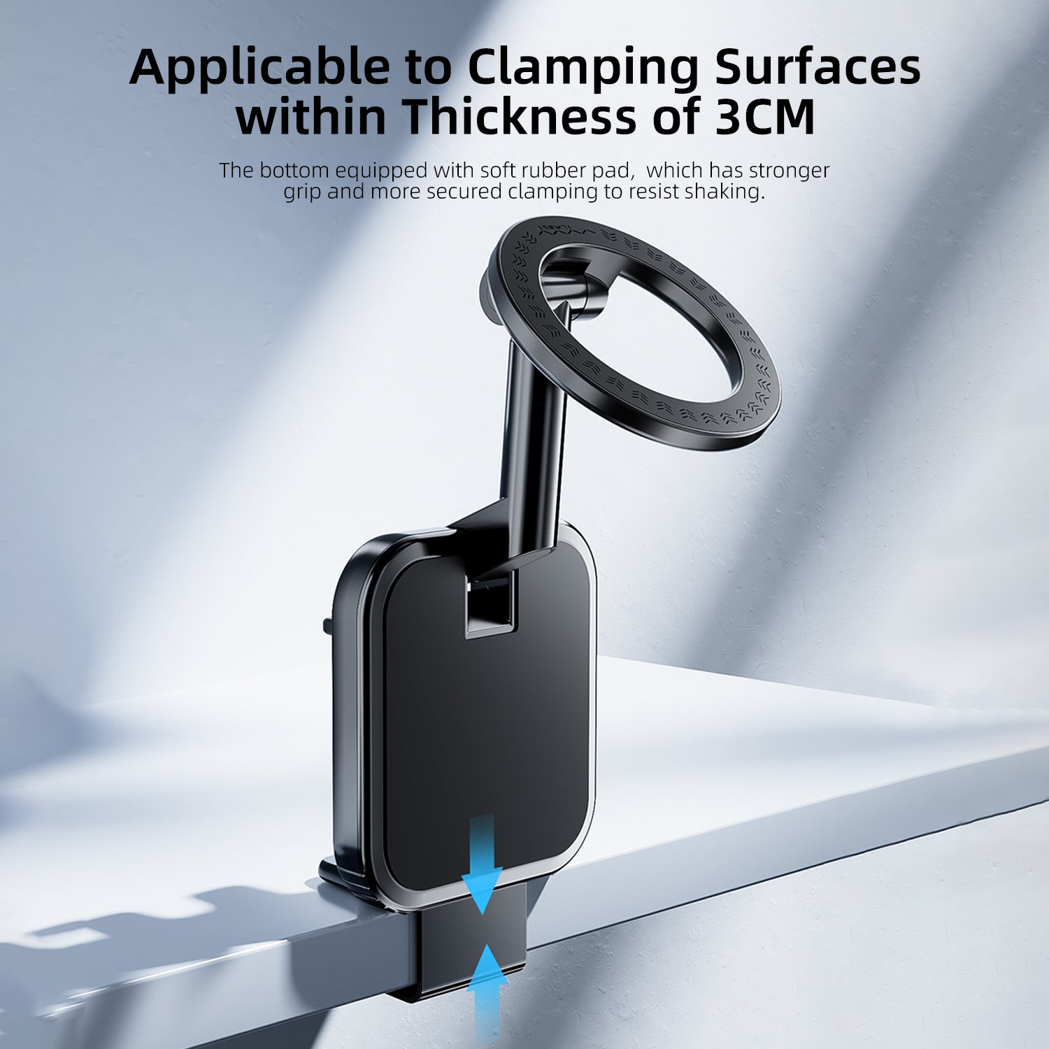 How to Use: Method 1: Push the inner button to open the bottom clamp. Attach the product to airplane tray, desk edge, or cabinet edge. Secure your phone in place using the top clamp.Method 2: patch the product to the magnetic circle