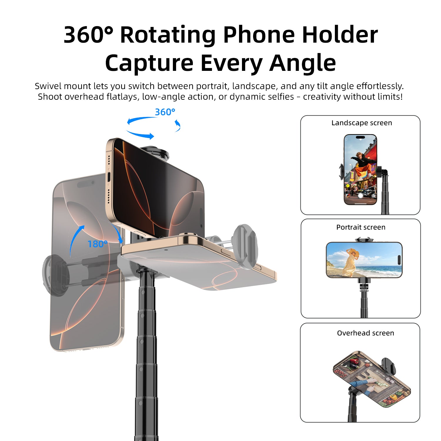 Multi-Angle Shooting: The phone holder can tilt and rotate 360 degrees, catering to multi-angle shooting needs. Ideal for horizontal and vertical videos, as well as overhead and low-angle shots, perfect for capturing diverse scenes.
